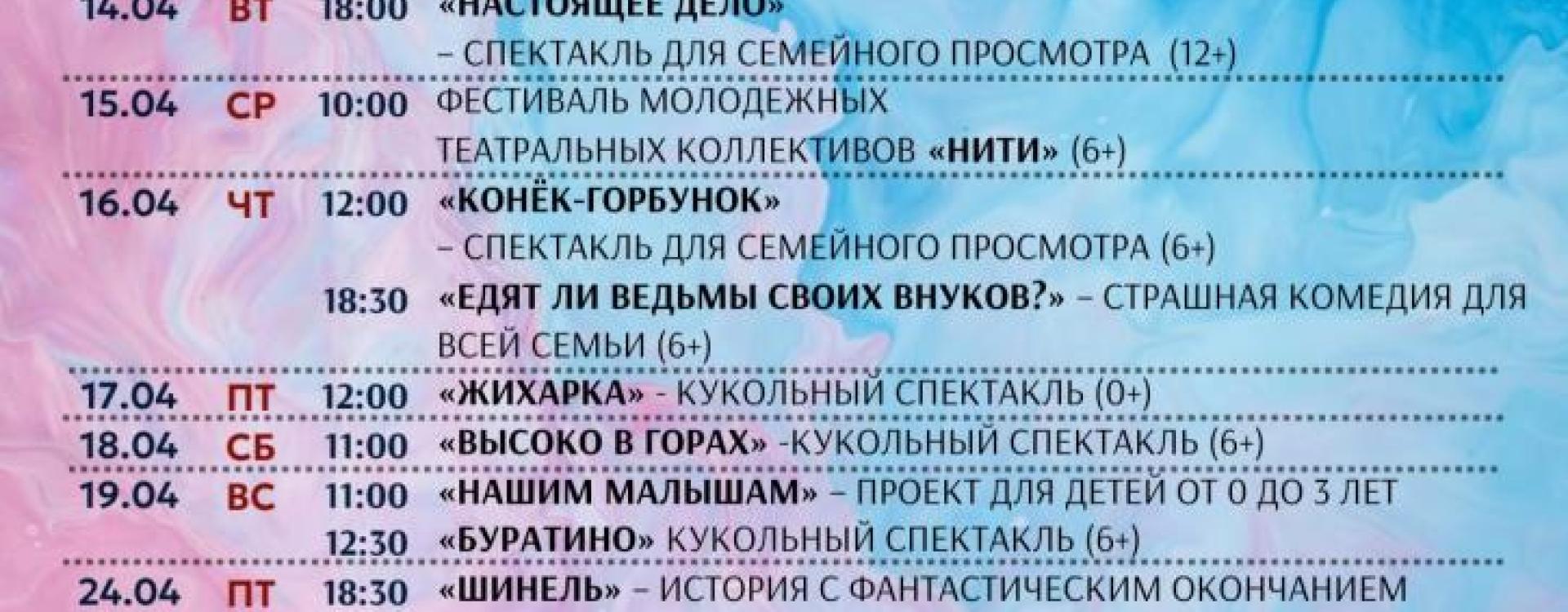 0+ПоказыУчаствует в программе "Пушкинская карта": нет Создатели стектакляРежиссёр: Имя режиссёраХудожник: Имя художника Уважаемые зрители, нажмите на кнопку "купить билет" и выбирайте спектакль.